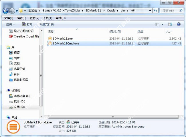 1、進(jìn)入Crack-Bin文件,根據(jù)自己的操作系統(tǒng)選擇對(duì)應(yīng)的破解文件覆蓋,如x64則將x64文件中的“3DMark11.exe”和“3DMark11Cmd.exe”復(fù)制到