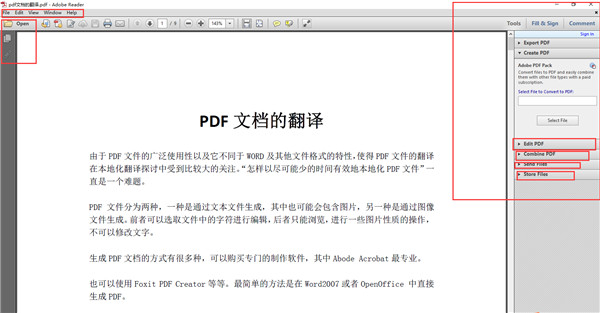 2、打開(kāi)PDF文件后,右側(cè)會(huì)出現(xiàn)一個(gè)菜單欄,這里布局了一些常用工具如:編輯pdf,合并內(nèi)容等。