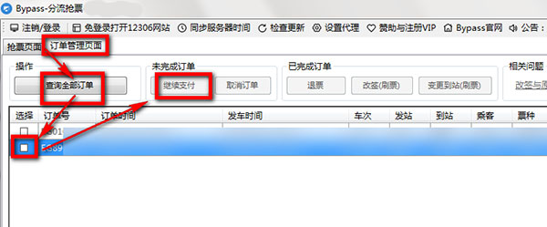 運(yùn)行打開12306bypass,然后選擇【訂單管理頁面】——【查詢?nèi)坑唵巍?mdash;—【勾選需要的車次訂單】——【選擇繼續(xù)支付】然后選擇需要的支付方式支付即可。