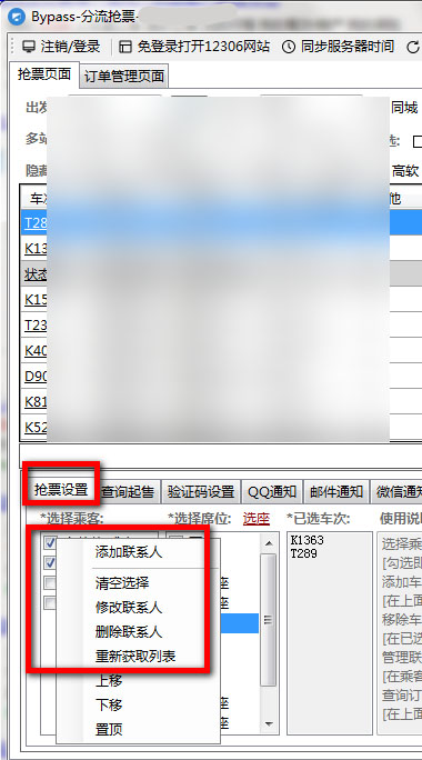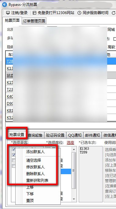 運(yùn)行打開12306bypass,然后選擇左下角的【搶票設(shè)置】然后在選擇乘客界面空白位置鼠標(biāo)右鍵【添加聯(lián)系人】,輸入相應(yīng)的信息添加即可。
