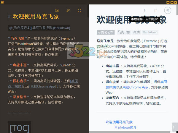 1、馬克飛象是一個(gè) Web App,在網(wǎng)頁(yè)中提供一個(gè)可以和印象筆記/Evernote International帳號(hào)進(jìn)行授權(quán)鏈接的 Markdown語(yǔ)法編輯器。和其它眾多主流Markdown編輯器一樣,在界面的右邊提供了一個(gè)實(shí)時(shí)預(yù)覽編輯效果的窗口,同時(shí)支持代碼高亮、修改編輯器字體/右側(cè)預(yù)覽窗口字體的效果。用戶可以通過(guò)使用不同的預(yù)覽字體,來(lái)達(dá)到修改同步到印象筆記文本中字體的效果。