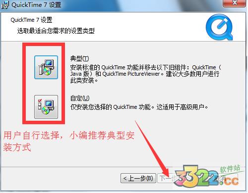 4:這里有兩種安裝方式可供用戶選擇,一種是“典型”,還有一種是自定義,唯一的區(qū)別就是,用戶如果只選擇自定義的話。那么軟件就將只安裝“QuickTime”這個(gè)功能,小編在這里推薦大家使用“典型”的安裝方式進(jìn)行安裝,選擇好之后點(diǎn)擊“下一步”,如kkx分享的圖片: