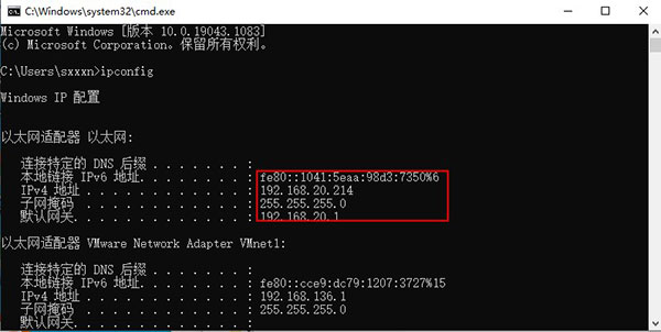 3、在本機命令行輸入:ipconfig,找到本機的ip地址。