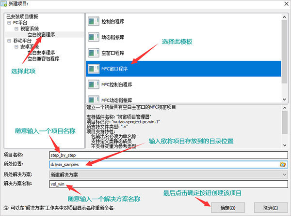 3、啟動(dòng)火山平臺(tái)后,點(diǎn)擊執(zhí)行“文件->新建->項(xiàng)目”菜單功能,并在左側(cè)“已安裝項(xiàng)目模板”樹(shù)形框中選擇“空白視窗程序”,右側(cè)列表框中選擇“MFC窗口程序”,以此輸入項(xiàng)目信息,如kkx分享的截圖:
