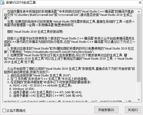 注意:因?yàn)橐暣捌脚_(tái)會(huì)把用戶的火山程序編譯為C++語(yǔ)言源程序,然后轉(zhuǎn)交給C++本地編譯器去進(jìn)行編譯,因此需要系統(tǒng)中安裝有微軟公司的VC編譯器,如果您的系統(tǒng)中尚未安裝,則啟動(dòng)編譯時(shí)將會(huì)自動(dòng)提示安裝,如kkx分享的截圖: