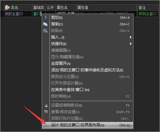 6、右鍵單擊該類(lèi),在所彈出來(lái)的菜單中選擇“設(shè)計(jì)我的主窗口的界面布局”,如kkx分享的截圖: