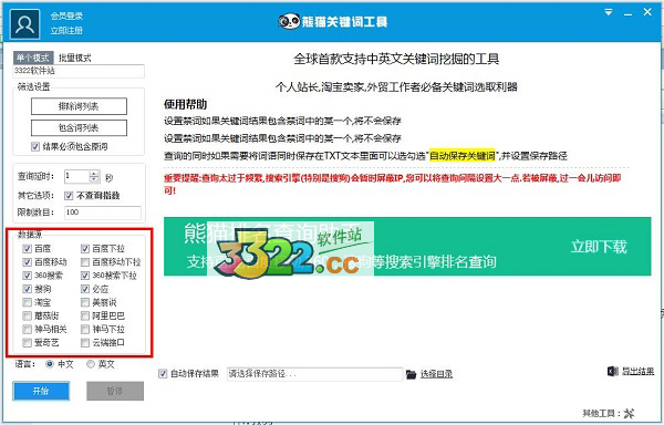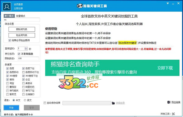 熊貓關(guān)鍵詞工具箱是一款強(qiáng)大的關(guān)鍵詞挖掘根據(jù),熊貓關(guān)鍵詞工具是基于百度、360、搜狗等瀏覽器長尾詞挖掘工具,其是國內(nèi)第一款支持中英文關(guān)鍵詞挖掘的工具,并且支持百度、360、搜狗、必應(yīng)、淘寶、蘑菇街、神馬和愛奇藝等諸多數(shù)據(jù)源的關(guān)鍵詞搜索,同時(shí)允許用戶自定義關(guān)鍵詞的篩選,包括排除和包含,且用戶還可設(shè)置相應(yīng)的查詢延時(shí),由于用戶在使用熊貓關(guān)鍵詞工具箱的時(shí)候若查詢太過于頻繁,則搜索引擎(特別是搜歌)會暫時(shí)屏蔽用戶的IP,用戶可以將查詢間隔設(shè)置大一點(diǎn),若被屏蔽,過一會兒訪問即可。熊貓關(guān)鍵詞工具箱還支持批量查詢功能,熊貓關(guān)鍵詞工具箱可允許2000個關(guān)鍵詞一起搜索與查詢,非常的給力!