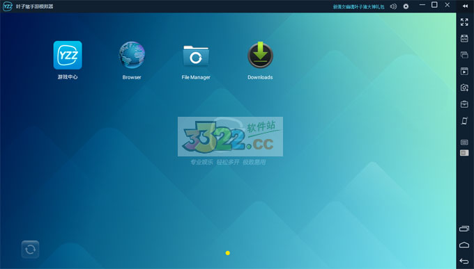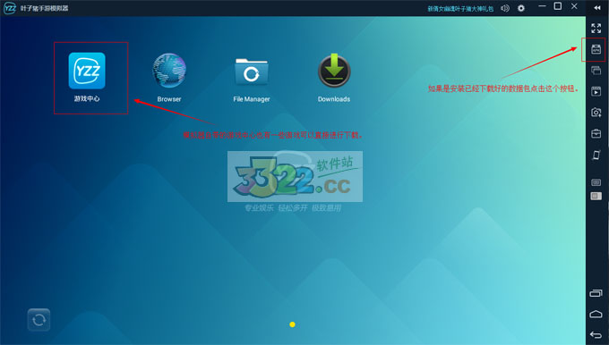 2.進(jìn)入模擬器的主界面后,如果是安裝已經(jīng)下載好的數(shù)據(jù)包,點(diǎn)擊屏幕右側(cè)的apk圖標(biāo)就可以進(jìn)行安裝。“游戲中心”也可以一些來自葉子豬官網(wǎng)的游戲資源,下游戲的話也可以在這里下載。