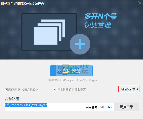1.啟動軟件的安裝程序,如果需要更換安裝位置點(diǎn)擊“自定義安裝”就可以進(jìn)行更改。