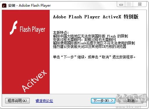 Adobe Flash Player是比用的瀏覽器插件。從30版本開(kāi)始,國(guó)內(nèi)用戶使用使用2144提供的特供版,而這個(gè)特供版特別的惡心,軟件內(nèi)充斥著各種廣告插件,彈窗窗口和捆綁流氓軟件行為,有時(shí)候你安裝了他們的版本,你就會(huì)在桌面上發(fā)現(xiàn)多出了一個(gè)游戲圖標(biāo)。于是你肯定會(huì)想,大不了我用國(guó)際版的總行了吧。但是如果你安裝國(guó)際版的Flash Player,軟件會(huì)聯(lián)網(wǎng)訪問(wèn)某個(gè)網(wǎng)站,里面定義了如果是中國(guó)地區(qū)的用戶,那么直接跳轉(zhuǎn)到2144提供的網(wǎng)站。當(dāng)你下載下來(lái)的時(shí)候安裝完,才發(fā)現(xiàn)自己上當(dāng)了,還是原來(lái)的配方,還是原來(lái)的味道。也許你已經(jīng)知道了其他的方式讓自己安裝國(guó)際版,比如斷網(wǎng)離線安裝法,防火墻阻斷,但這些都不能夠有效的解決問(wèn)題,有時(shí)候在播放網(wǎng)頁(yè)視頻的時(shí)候會(huì)提示地區(qū)不符合的彈窗。所有,今天小編就給大家淘來(lái)了某論壇修改了Flash Player特別版。此版本基于國(guó)際最新版制作。包含ActiveX、PPAPI、NPAPI三個(gè)版本,