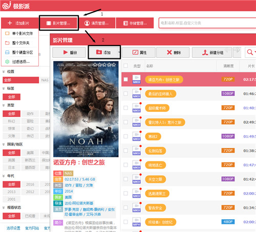 4、點(diǎn)擊影片管理,添加可以影片文件進(jìn)行命名,標(biāo)簽,排序等操作