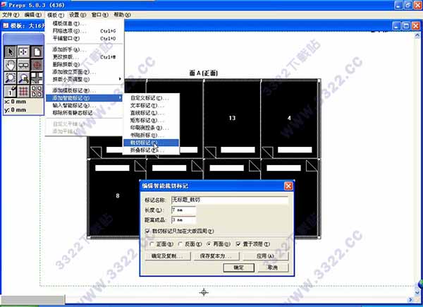 4、智能的SMART標(biāo)記作用,能夠動(dòng)態(tài)性擺放并修改尺寸,包含自定標(biāo)記丶文字標(biāo)記丶線標(biāo)記丶方形標(biāo)記丶反復(fù)標(biāo)記丶帖標(biāo)丶裁剪標(biāo)記丶拆疊標(biāo)記等。其部位可相較于印張尺寸丶裝訂線或界面的方式界定標(biāo)記或標(biāo)記組自動(dòng)調(diào)整,同時(shí)可將標(biāo)記存放為模版。當(dāng)模版導(dǎo)入到一個(gè)新的工作時(shí),這種標(biāo)記會(huì)自動(dòng)再定位和再次轉(zhuǎn)變規(guī)格。SmartMarks軟件的標(biāo)記也可以依照相對(duì)性界面的部位擺放