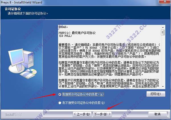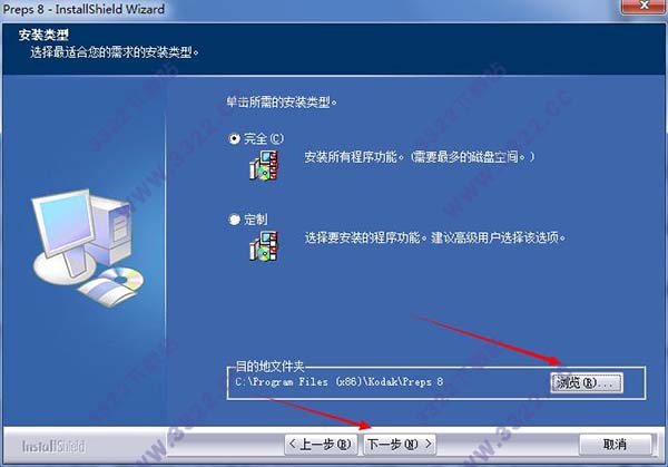 4、軟件默認(rèn)的安裝路徑是C:\Program Files (x86)\Kodak\Preps 8,如需安裝到其他盤符下請(qǐng)點(diǎn)擊“更改”,選后路徑后點(diǎn)擊確定,然后點(diǎn)擊下一步。