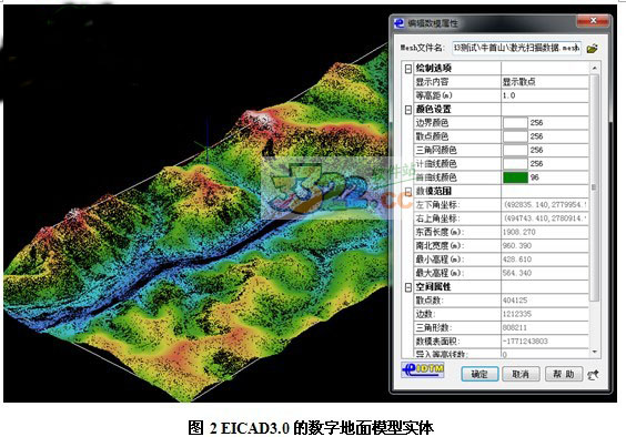 在某山區(qū)高速公路工程設(shè)計(jì)項(xiàng)目中,EICAD 3利用海量的激光掃描數(shù)據(jù)集( 數(shù)據(jù)采集點(diǎn)數(shù)超過1000萬點(diǎn))成功地構(gòu)造了數(shù)字地面模型,在保持原始數(shù)據(jù)不損失的情況下,EICAD 3能夠?qū)崿F(xiàn)地形曲面網(wǎng)格的多級簡化和抽稀,以滿足不同精度的使用需求。