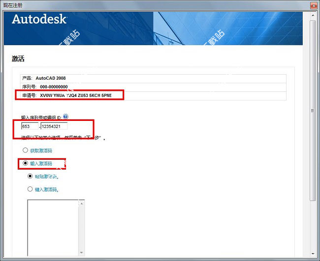 2、輸入序列號:653-12354321,并勾選“輸入激活碼”及“粘貼激活碼”,然后鼠標右鍵復(fù)制界面中的“申請?zhí)?rdquo;,之后將該注冊窗口暫時放置一邊