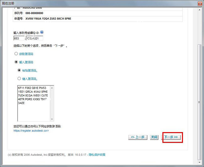 4、回到剛才放置一邊的注冊界面,將剛才復(fù)制的激活碼粘貼到如下圖的位置中,并點擊下一步