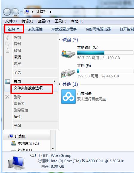 ★打開計算機,點擊“組織”—“文件夾搜索選項”