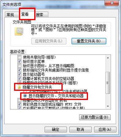 ★點擊“查看”,在“隱藏文件和文件夾”,勾選“顯示隱藏的文件、文件夾和驅(qū)動器”,完成點擊確定
