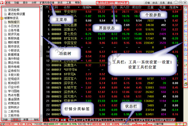 【功能樹】在畫面的左側(cè),包括功能、資訊、股票、指標(biāo)四棵樹,囊括了系統(tǒng)大部分功能和操作。