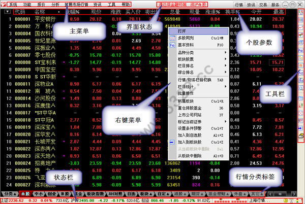【行情分類標(biāo)簽】此標(biāo)簽頁按不同的股票類型分類。點(diǎn)擊此標(biāo)簽進(jìn)入此板塊股票信息。