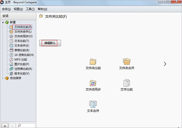 1、打開(kāi)軟件,選擇左邊的“文件夾比較”,在右邊的界面點(diǎn)擊“編輯默認(rèn)”按鈕,從而來(lái)改變文件夾比較時(shí)的默認(rèn)設(shè)置;
