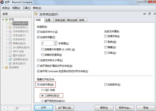 2、在打開(kāi)的文件夾比較設(shè)置對(duì)話框,在比較下勾選“比較內(nèi)容”,在此目錄下選擇“二進(jìn)制比較”,如下圖所示;
