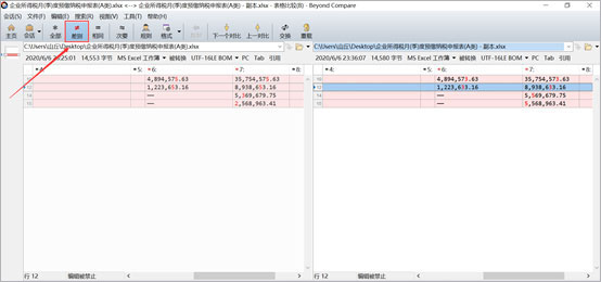 2、對(duì)比結(jié)果中存在差異點(diǎn)的所在行都被顯眼的紅色標(biāo)出,能非常清楚明了的對(duì)比出兩者的差異,在左下角還可以找到差異行的數(shù)量,以了解兩個(gè)表格的整體差異