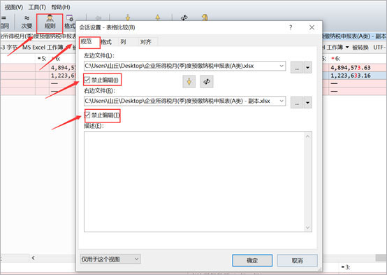 但絕大多數(shù)情況下軟件會(huì)禁止表格編輯。我們需要設(shè)置一下允許編輯,首先點(diǎn)擊“規(guī)則”,接著選擇“規(guī)范”,然后取消勾選“禁止編輯”,最后點(diǎn)擊一下“確定”,我們就可以直接在Beyond Compare中修改表格內(nèi)容了。