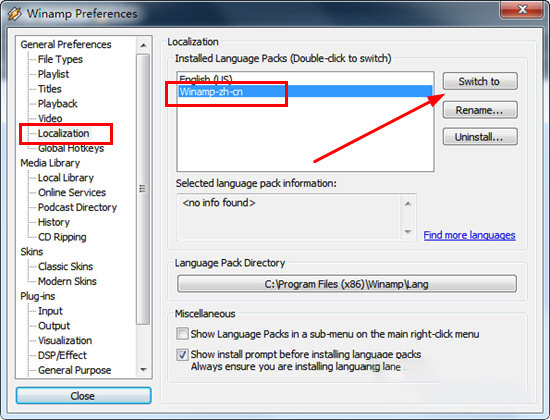 4、在左邊的欄目中點擊“Localization”欄,選擇紅框標注內的“ZH-CN”選項,點擊其中的Switch to選項即可切換為中文,如下圖所示: