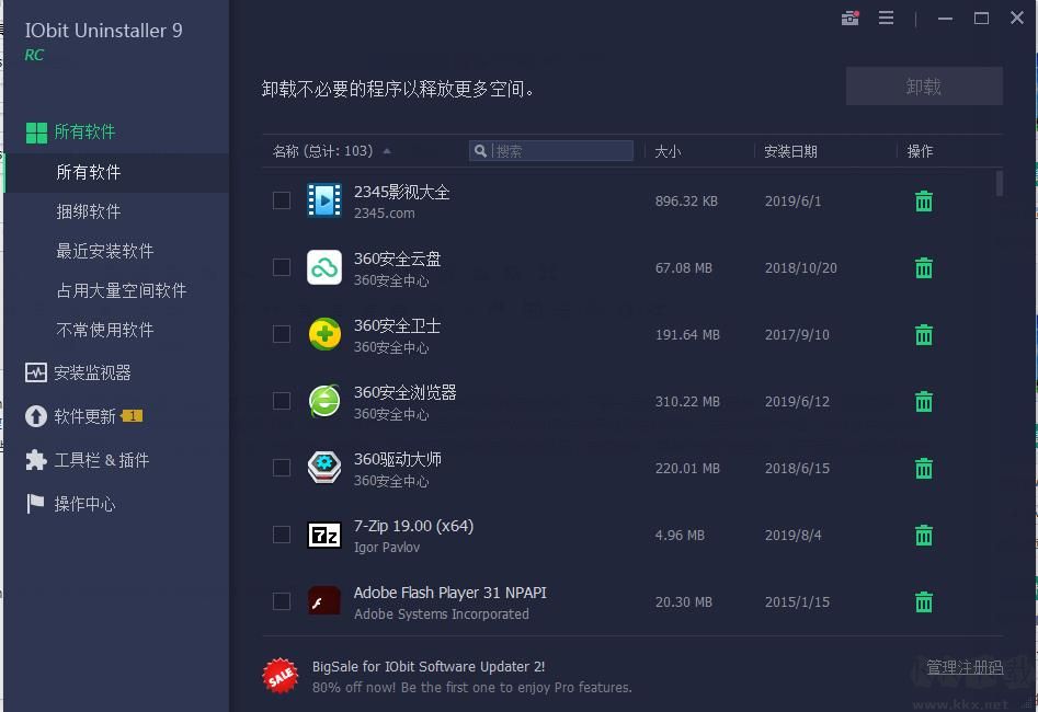 IObit Uninstaller是一款非常專業(yè)強(qiáng)大的軟件管理卸載工具,它可以幫助你把系統(tǒng)中的軟件完全卸載,不留一點(diǎn)痕跡,包括注冊表、臨時文件、垃圾文件,功底非常深厚,當(dāng)遇上Windows自帶的卸載程序卸載不了時,你就可以使用它!而且還可以對Win10系統(tǒng)自帶應(yīng)用進(jìn)行卸載,在軟件卸載方面,絕對是專業(yè)水平。KK下載站這次給大家分享下IObit Uninstaller Pro(專業(yè)版)破解版。此版本已經(jīng)集成專業(yè)版激活碼,完成破解,并制作成了綠色版,打開后可以直接免費(fèi)使用。