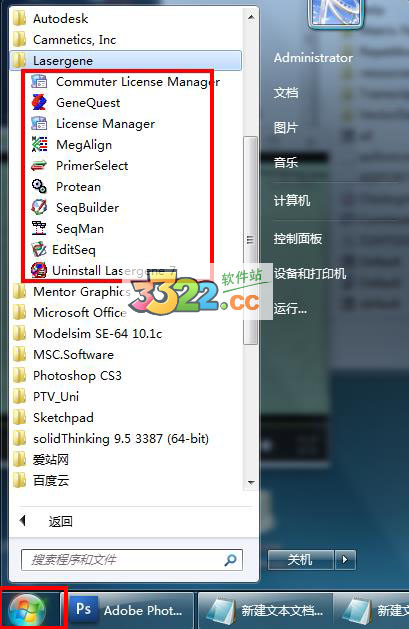“開始”菜單(菜單在桌面左下角,圖案為Windows官方標(biāo)志)-所有程序-“Lasergene”文件夾-然后用戶自主選擇需要使用的功能程序
