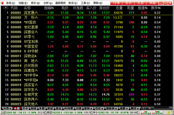 進(jìn)入系統(tǒng)后,屏幕上首先出現(xiàn)行情顯示窗口,列表顯示最新股票交易行情。窗口頂部是主菜單條。注意,主菜單條的右端有兩組按鈕,分別控制系統(tǒng)窗口和其子窗口的最小化、層疊/還原、關(guān)閉。該系統(tǒng)支持整屏放大功能,整個(gè)界面就像在DOS下一樣。拖動(dòng)縱向滾動(dòng)條,或按〖PageUp〗與〖PageDown〗,可看到更多股票的行情。拖動(dòng)橫向滾動(dòng)條,可看到更多欄目?jī)?nèi)容。