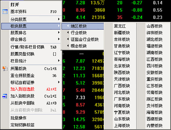 例如,右鍵點(diǎn)擊板塊股,會(huì)有下面的彈出菜單,供用戶切換到其他板塊的報(bào)價(jià)牌。
