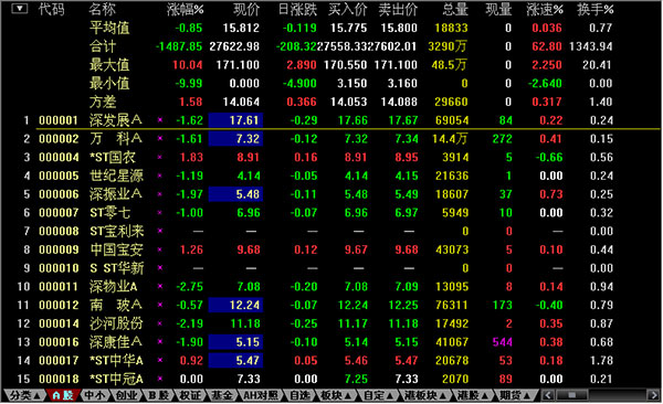 敲數(shù)字81、82、83、84、85、86、87,可分別調(diào)出上海A、B股,深圳A、B股,滬債、深債,深滬A股的綜合排名。系統(tǒng)用9個(gè)排成方陣的小窗列出所選市場(chǎng)的股票的漲幅、跌幅、振幅、5分鐘漲幅、5分鐘跌幅、量比、委比、成交金額排名。
