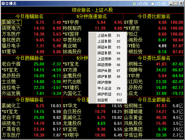 在綜合排名中可以使用右鍵菜單選擇查看不同的市場(chǎng)信息,同時(shí)可以按“3行3列”或“1行4列”的方式選擇查看的方式。