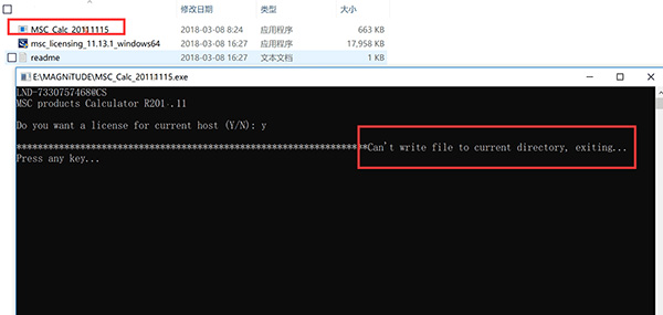 2、然后首先先在MAGNiTUDE文件夾中找到MSC_Calc_20180531.exe主程序,然后右鍵以管理員身份運行,輸入Y,從而生成一個許可證文件license.dat,提示*Can"t write file to current directory, exiting.. ,說明權(quán)限不夠