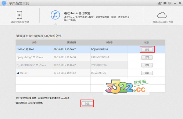 第二步:選擇想要恢復(fù)的備份文件,點(diǎn)擊【選定】。若未出現(xiàn)設(shè)備信息,可點(diǎn)擊下方的【瀏覽】手動(dòng)選擇 iTunes 備份文件。