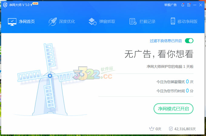 這里可以見到今日為您屏蔽掉的宣傳次數(shù),也有凈網(wǎng)方式的電源開關(guān)都在這里。