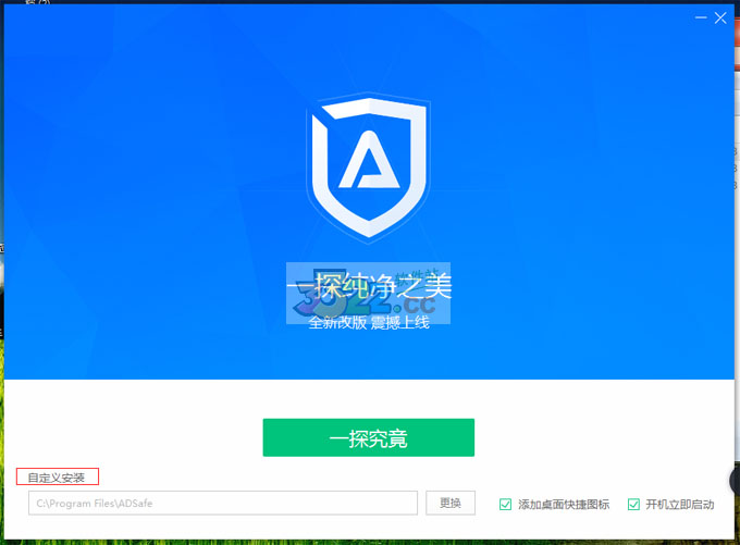 1.啟動(dòng)軟件的安裝程序之后,如果需要更換軟件的安裝位置的話,只要點(diǎn)擊左下角的“自定義安裝”就可以了,還可以設(shè)置快捷方式的創(chuàng)建、開機(jī)啟動(dòng)的設(shè)置。