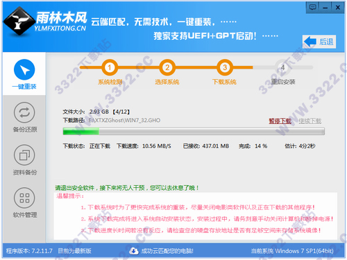 2、斷點下載續(xù)傳,安全高效,性能穩(wěn)定,雨林木風重裝系統承諾:系統重裝不黑屏,無病毒,不死機,絕對安全、可靠、穩(wěn)定、快速!所有系統均來自互聯網測試整理。