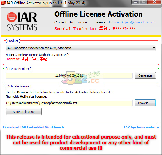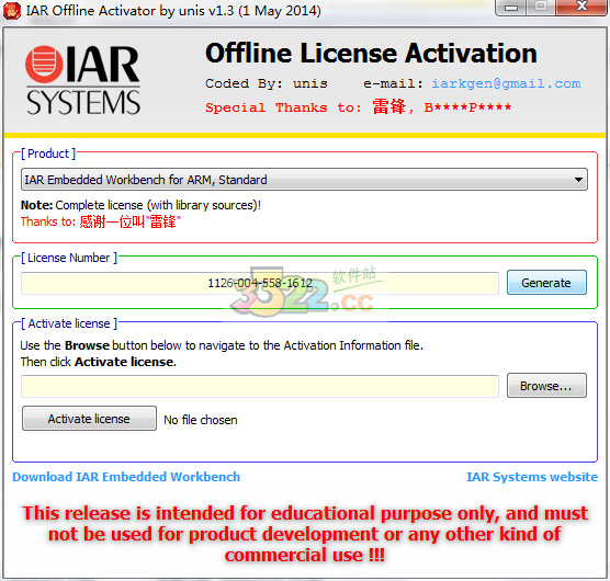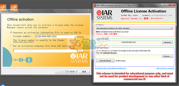 4、在注冊(cè)機(jī)中選擇好軟件,我們的軟件全稱是IAR Embedded Workbench for ARM。然后將激活碼生成,復(fù)制到注冊(cè)窗口。