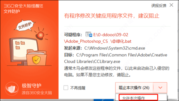 3、綠化的過程中會有殺毒軟件彈出提示,選擇允許即可,最后耐心等待綠化;