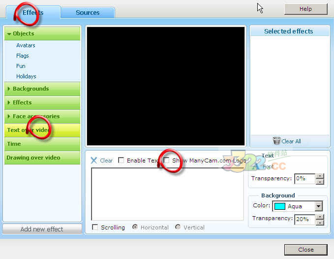 1.ManyCam去除水印, 打開主界面,Text over video(水印)->取消Show ManyCam.com Logo。
