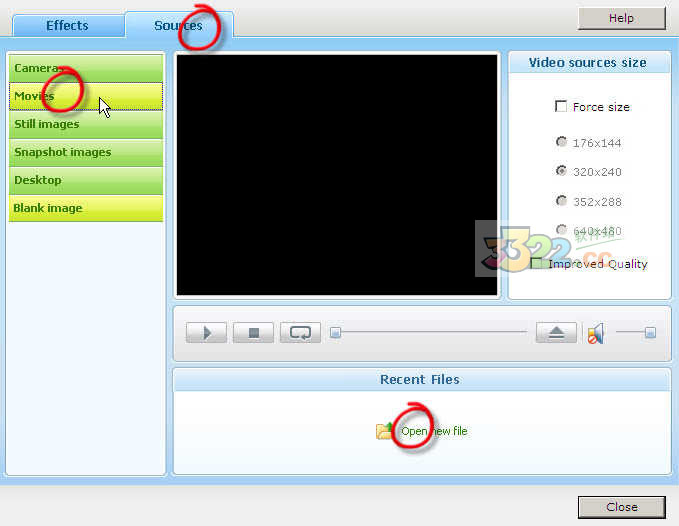 2.使用假視頻,Sources(指定視頻源)->Movie(電腦視頻)->open new file(打開新文件)。