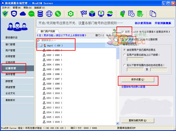 另外:如果不想手動添加帳號,可以在添加完部門后,打開 帳號總注冊開關(guān),以及部門的帳號注冊開關(guān),這樣客戶端可以在注冊帳號時選擇屬于哪個部門,如下圖(一定要打開注冊總開關(guān),以及確??梢宰詭ぬ柕牟块T左側(cè)有 小紅旗 圖標):