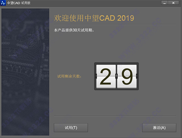 6、隨后回到桌面雙擊“中望CAD2019”的快捷圖標(biāo)打開,你會發(fā)現(xiàn)軟件已經(jīng)注冊成功了,不會有試用窗口單出,破解完成