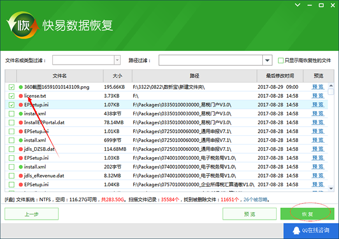 5、選擇需要恢復(fù)的文件,并點擊恢復(fù)開始恢復(fù)。