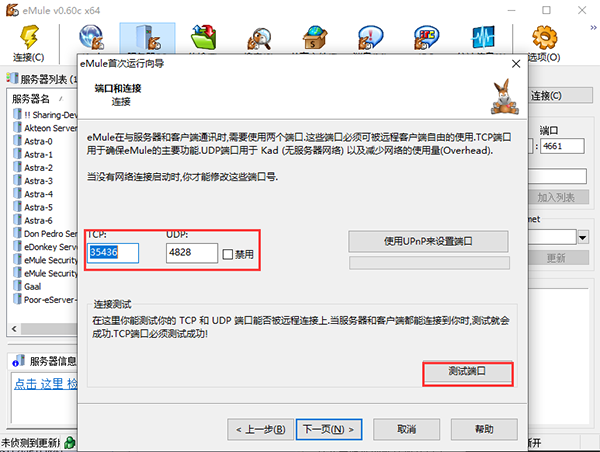 4、設(shè)置端口和連接,可以自定義也可以默認(rèn),然后點(diǎn)擊測試端口即可,點(diǎn)擊下一頁;
