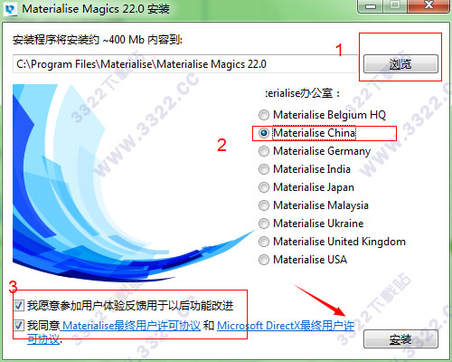 2.現(xiàn)在安裝位置,默認路徑為“C:\Program Files\Materialise\Materialise Magics 22.0”點擊“瀏覽”即可更改,在選擇安裝環(huán)境,選擇第二個,在創(chuàng)建桌面快捷方式前面勾上,不然等軟件安裝好后在你的電腦桌面找不到軟件哦,最后點擊“安裝”按鈕