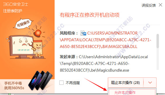 3.安裝過程中安全軟件會提示你有程序在修改開機啟動項,點擊“允許本次操作即可”